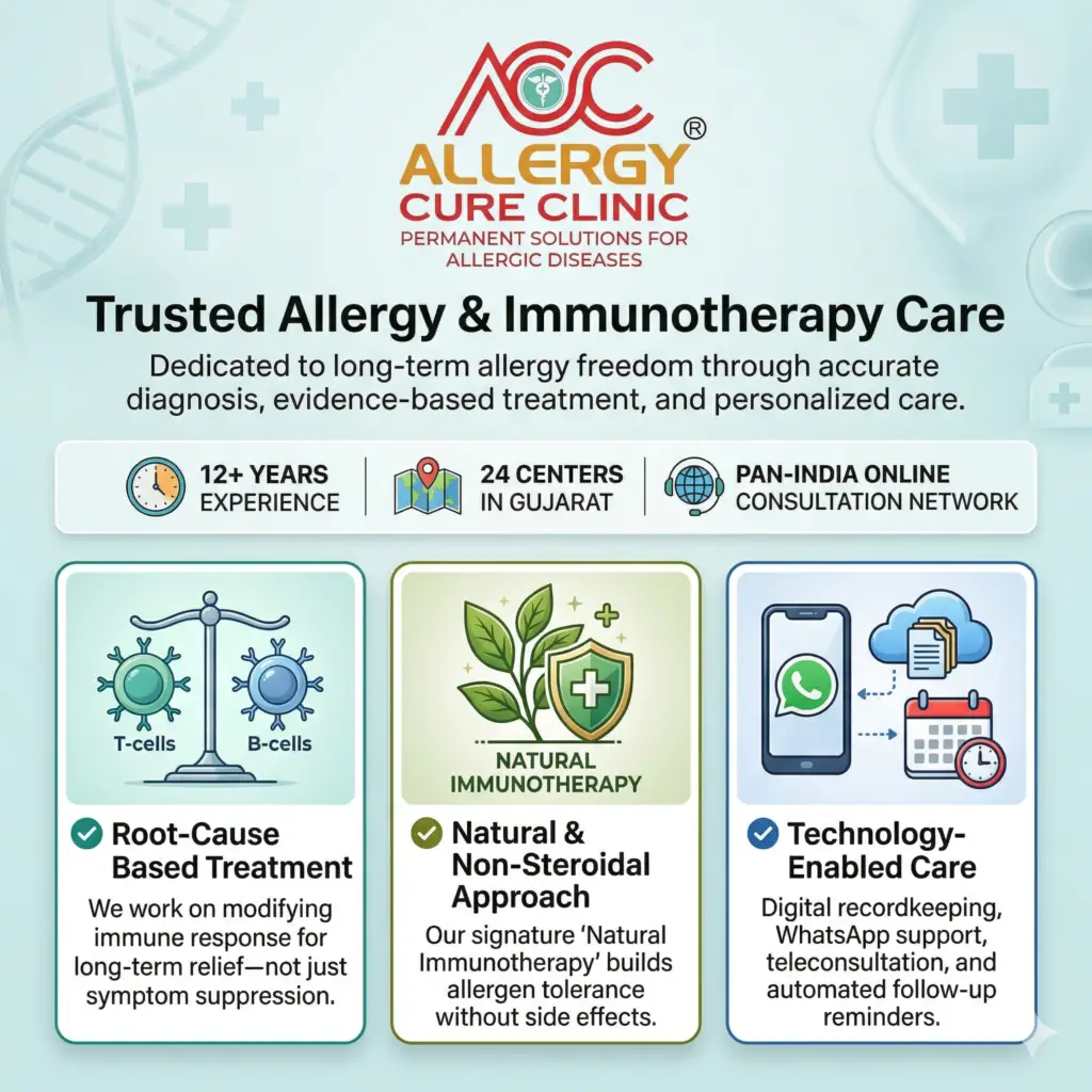 With 12+ years of experience, 24 centers across Gujarat, and a strong PAN-India online consultation network, we have become a trusted name in allergy and immunotherapy care